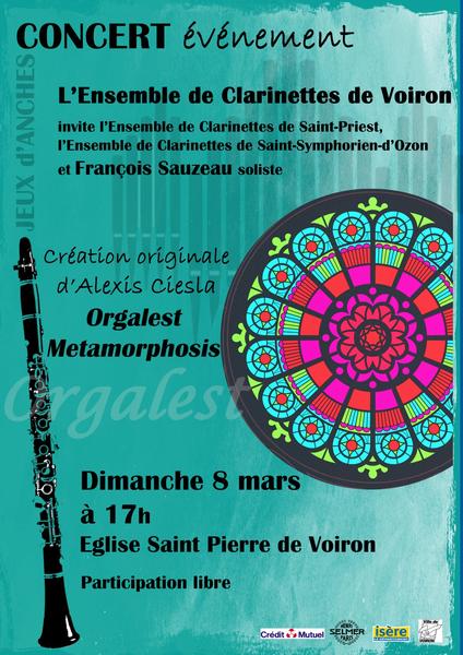 Venez découvrir la création de "Orgalest" par l'Ensemble de Clarinettes de Voiron, en collaboration avec le compositeur Alexis Ciesla et le soliste François Sauzeau. Une soirée musicale unique à ne pas manquer !